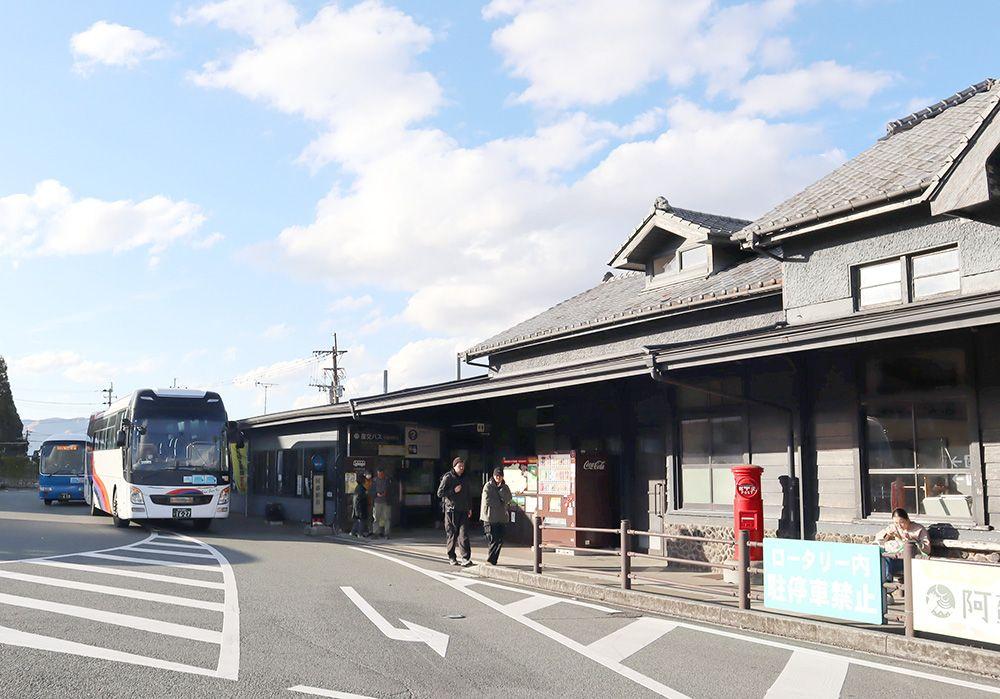 熊本桜町バスターミナルから約1時間半ほどで、最初の乗り継ぎ場所「阿蘇駅」に到着です。