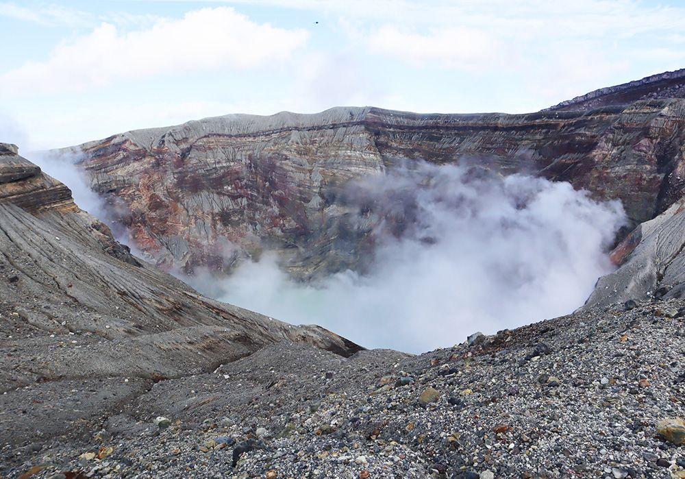 こちらが周囲4kmの巨大な噴火口。モクモクと白い噴煙を上げる様子は迫力満点です。