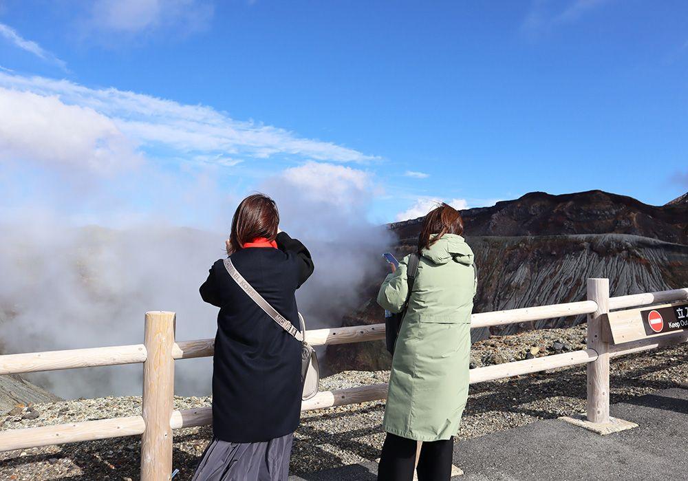 私たちはフリータイムの1時間を使って、現在も火山活動が続いている活火山・阿蘇中岳火口へ向かうことに。