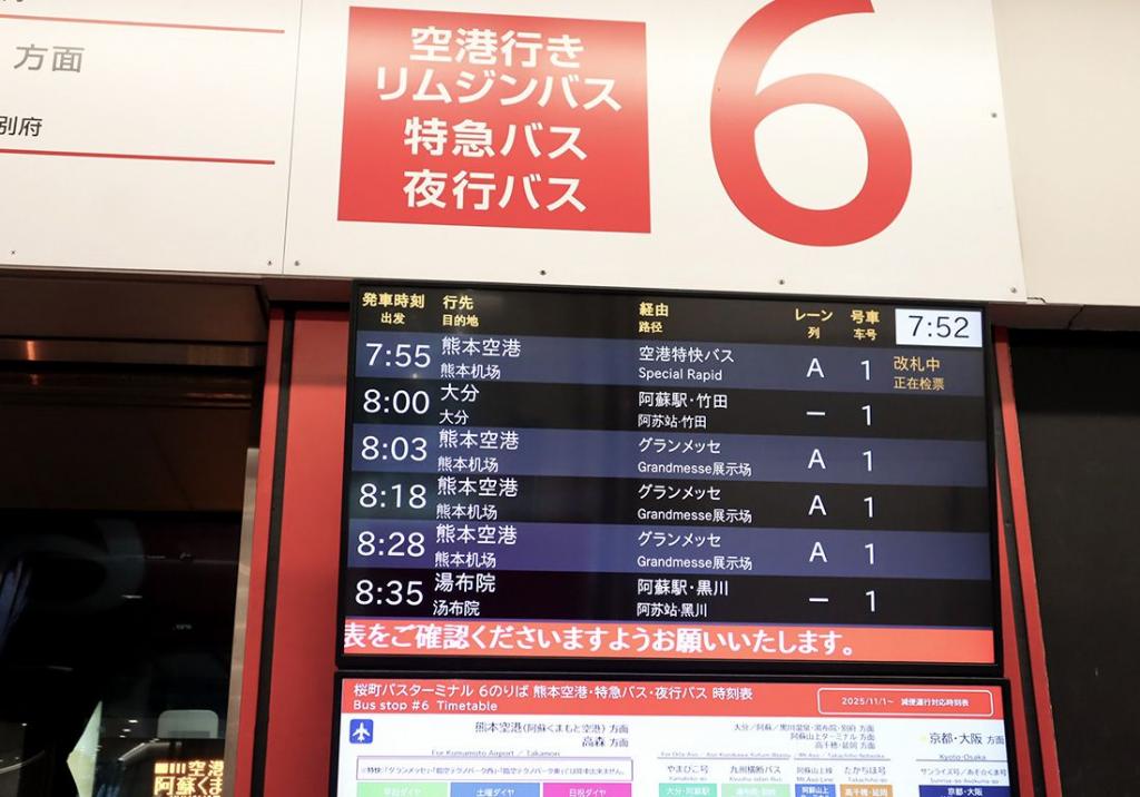 乗務員さんに「行程表・チケット」を提示して、「特急バスやまびこ号(熊本駅)」に乗車。車窓から見える阿蘇の景色にお別れをしながら、約1時間~1時間半で、予約時に指定した降車場所「熊本空港」「熊本桜町バスターミナル」「熊本駅前」に到着です。