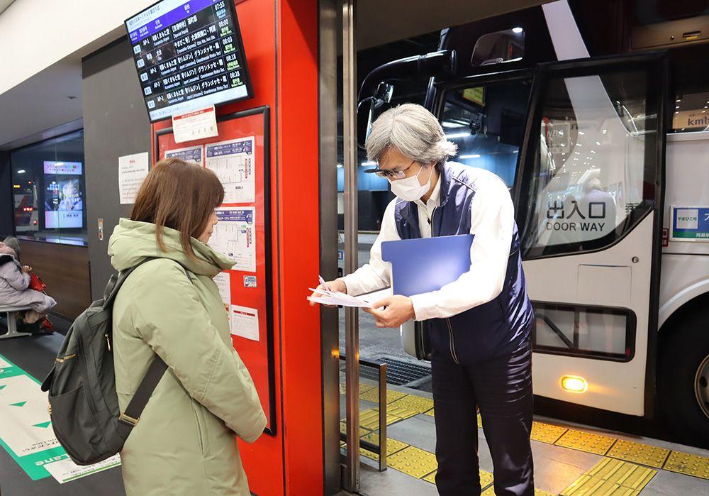 乗務員さんに「行程表・チケット」を提示して、バスに乗り込みましょう。