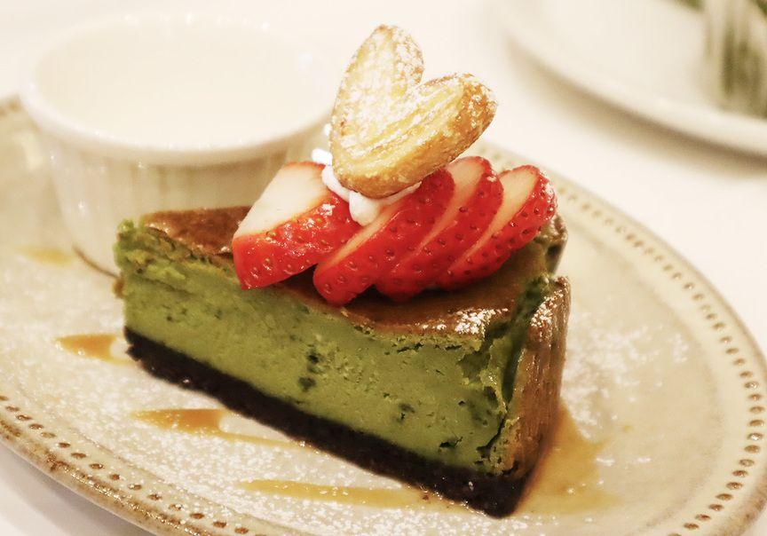 しっとりなめらかな食感が楽しめるクリームチーズケーキ。抹茶の味や香り、ほどよい苦みを活かすため、甘さは控えめです。お店ではソフトクリームを添えて提供され、ちょっと贅沢な気分が味わえます。