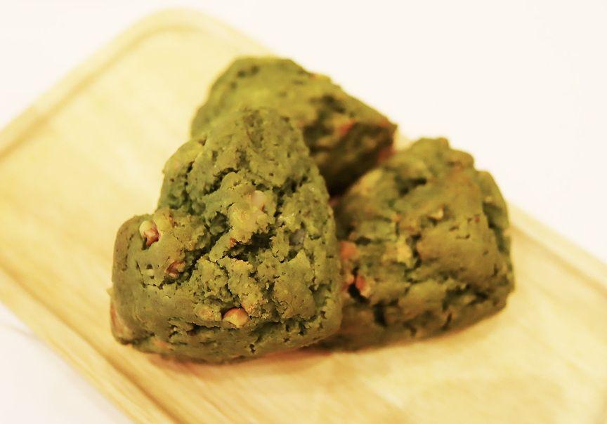 おやつにぴったり。濃い抹茶を使ったクッキー生地は少し固めで、外はサクサク、中はふんわり。抹茶の風味と食感の違いが楽しい一品です。