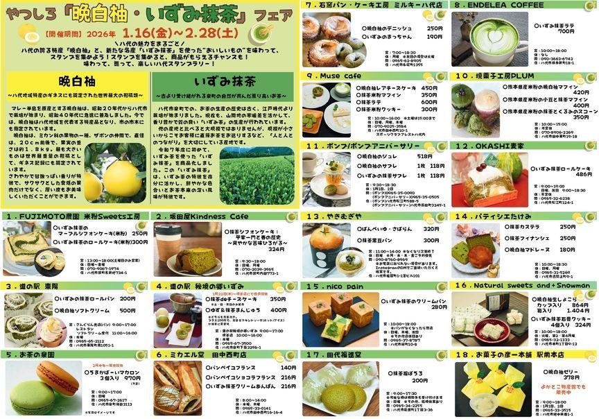八代地域を代表する特産品「晩白柚」と新たな名産「いずみ抹茶」を多くの人に知ってもらおうと今年からスタートしたイベント。ケーキやクッキー、ラテなど八代市内27の店舗で54種類のグルメを味わうことができます。