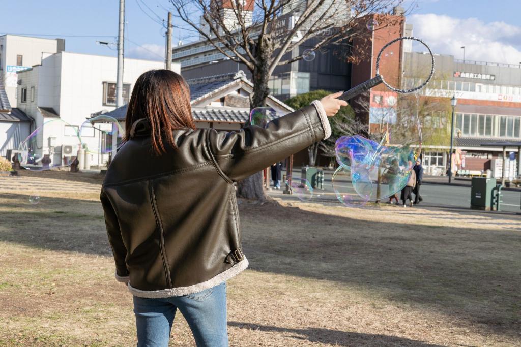 ラッキーなことに、こちらの公園では、竹馬やシャボン玉、連けん玉、バルーン風船など昔ながらの遊び道具を貸し出されているおじさまに出会うことができました。地域の方との温かなふれあいを通して、山鹿の魅力を改めて感じることができました。