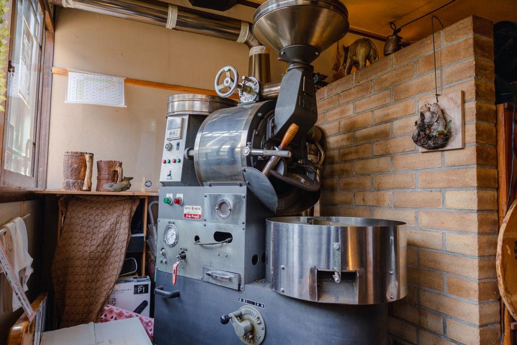 自家焙煎珈琲を楽しむことができるこちらのカフェは、入店するとすぐ、大きな焙煎機が出迎えてくれます。