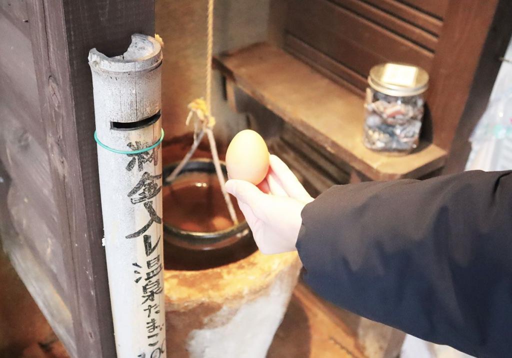 温泉街のあちこちで見かける「温泉卵」の無人販売。料金箱にお金を入れて、温泉卵をゲットするシステム。
