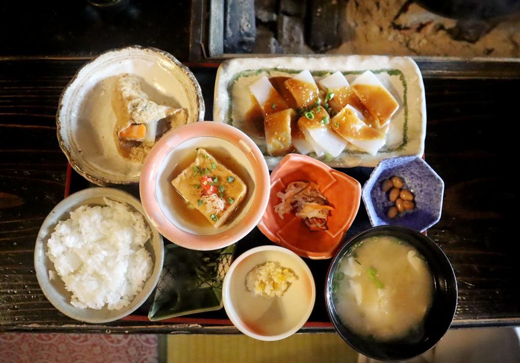 小鉢や刺身こんにゃく、お味噌汁など、素朴ながらも滋養味豊かな豆腐料理がズラリと並びます。