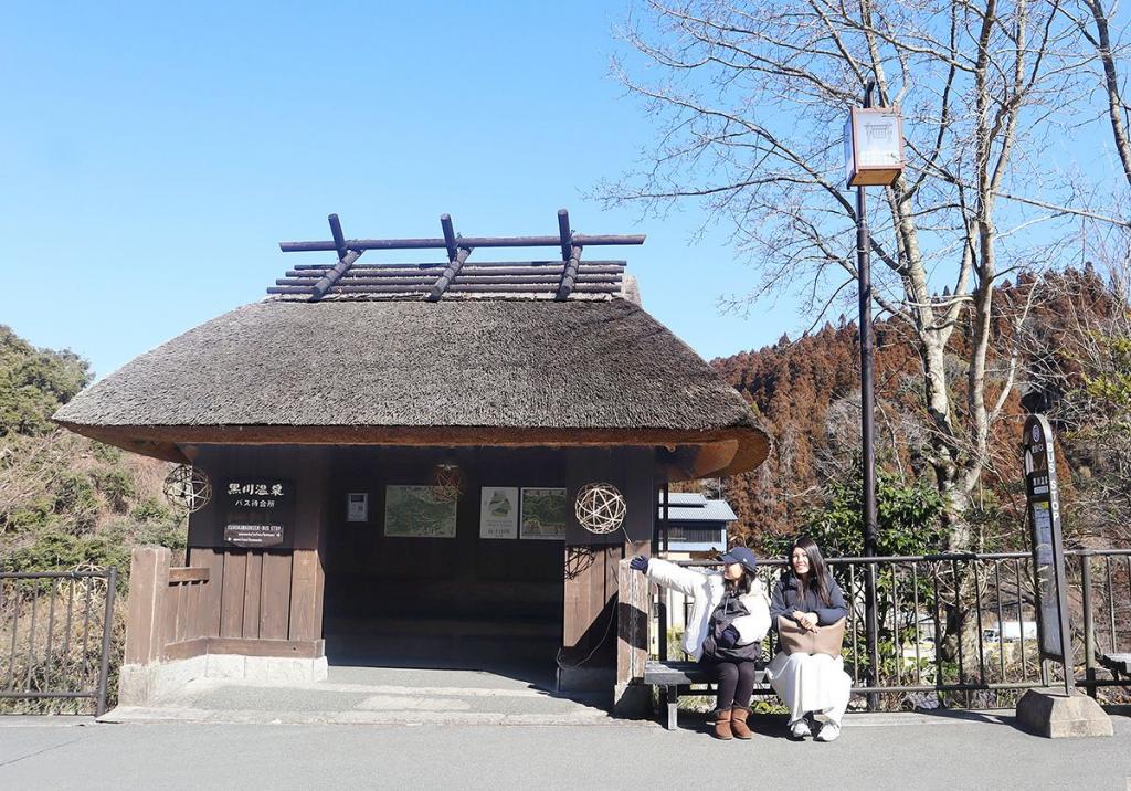 お昼ちょっと前に、茅葺屋根が目印の「黒川温泉」バス停に到着。