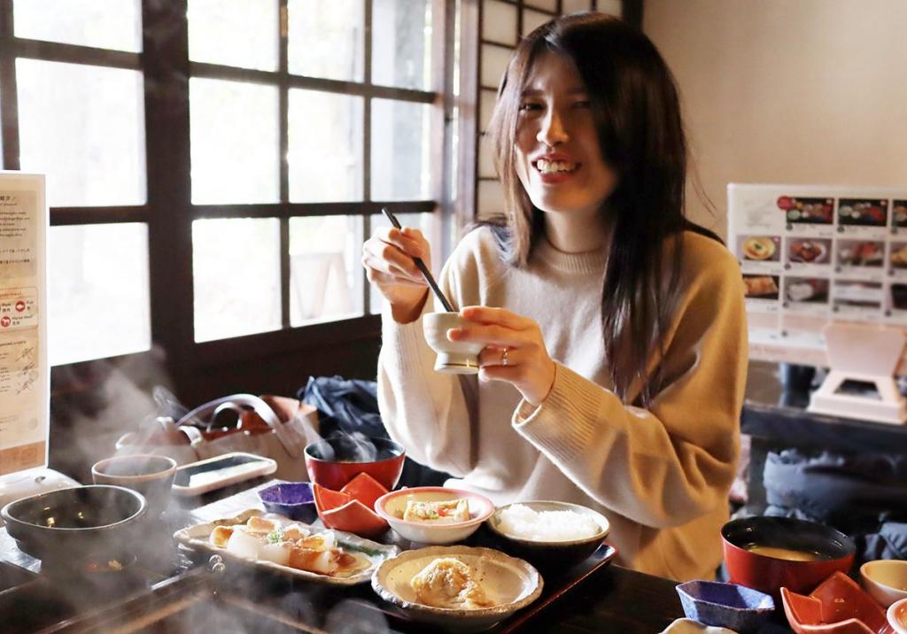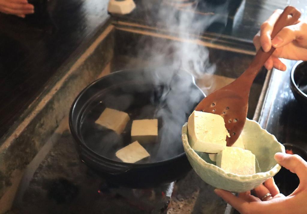 まずは、囲炉裏の鍋に自家製豆腐を入れて、あつあつの「湯豆腐」をパクリ! 濃厚なお味で、体の芯からポカポカに。