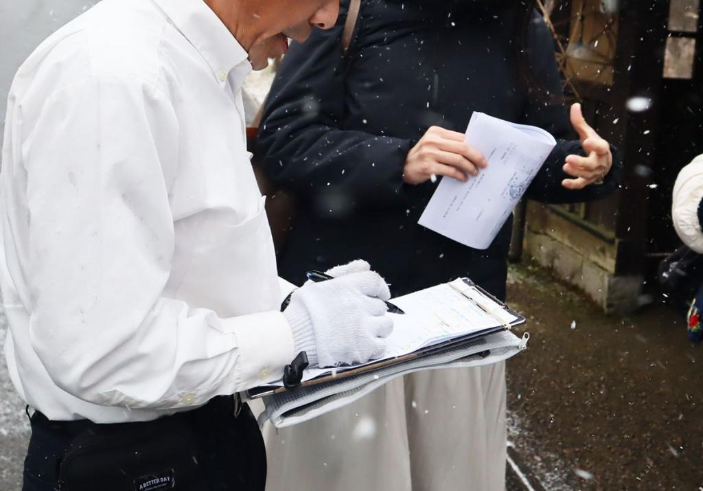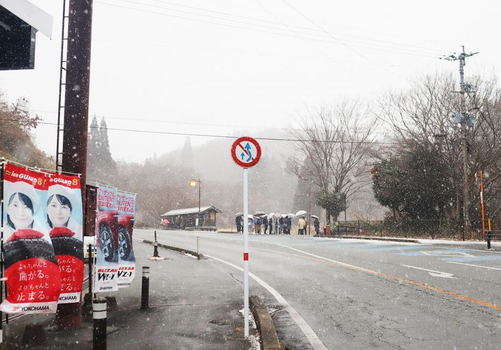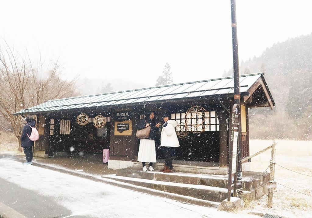 帰りの乗車場所は、最初に下車したバス停の反対側。雪が舞い、さらに風情が増した温泉街にお別れをしながら歩みを進めます。