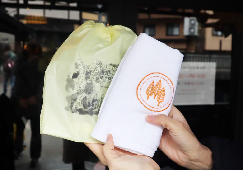 (右)今回は、入湯手形の緑色のシール(飲食・お土産用でもOK)を使って「タオルセット」と交換しました