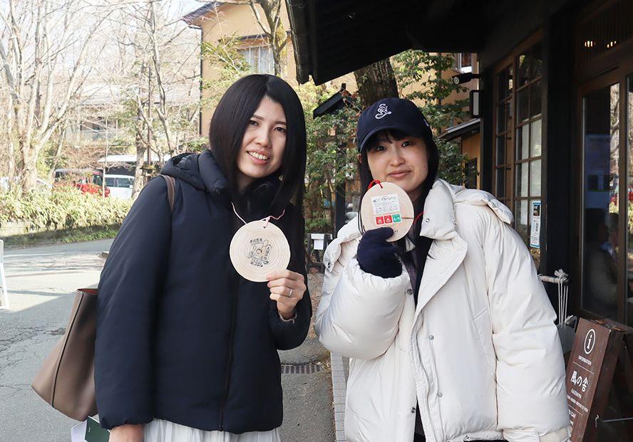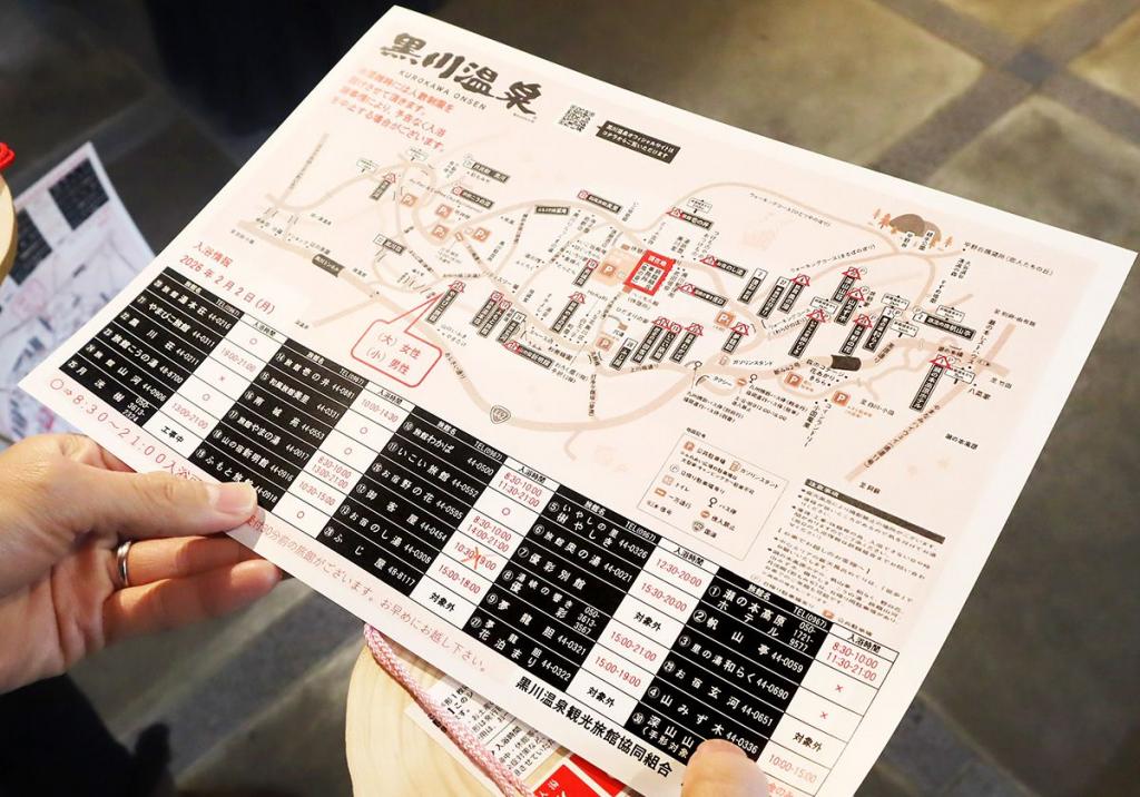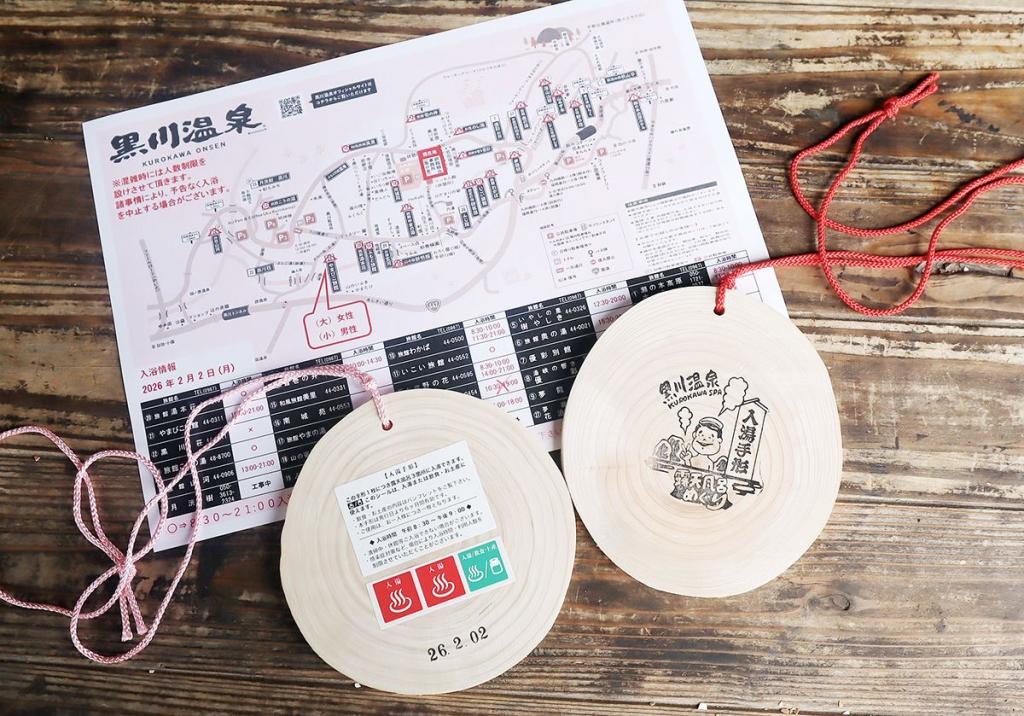 「入湯手形」は黒川温泉の旅館にある25ヶ所の露天風呂のうち、好きな3か所に入浴できるというもの。入湯手形の裏面にはシールが3枚貼られていて、赤色2枚は露天風呂に、緑色1枚は飲食やお土産にも利用可能。入浴可能時間が記載されたMAPを確認しながら、行きたい温泉を選ぶのがベストです。