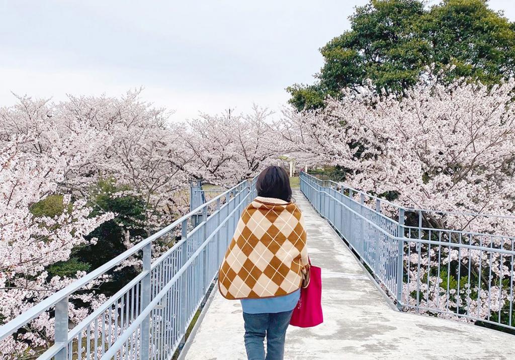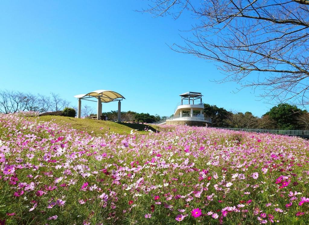 四季折々の花々が咲く公園としても有名。駐車場と展望台をつなぐ長さ230mの「中尾山スカイロード」からは、春は桜や菜の花、秋にはコスモスが咲く絶景を上空から眺められるようになっています。ゆるやかなスロープなので、小さい子どもや車椅子の人も安心。