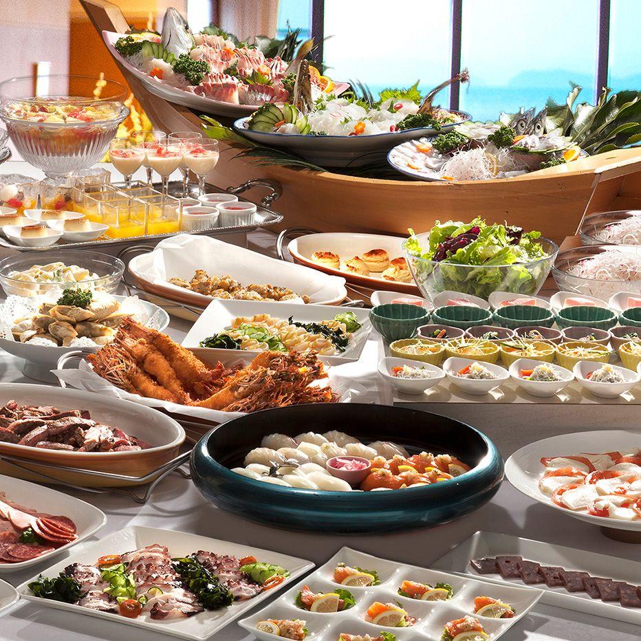 同ホテルでぜひ味わってもらいたいのが、和洋中60種類以上がラインナップされた夕食バイキング。太刀魚など新鮮な地魚の刺身は舟盛で登場するほか、お寿司や総菜など、地元食材を使った絶品料理がテーブルいっぱいに並びます。“湯の児特製カレー”は朝と夜で味付けが変わるので、こちらもぜひ堪能してみて。