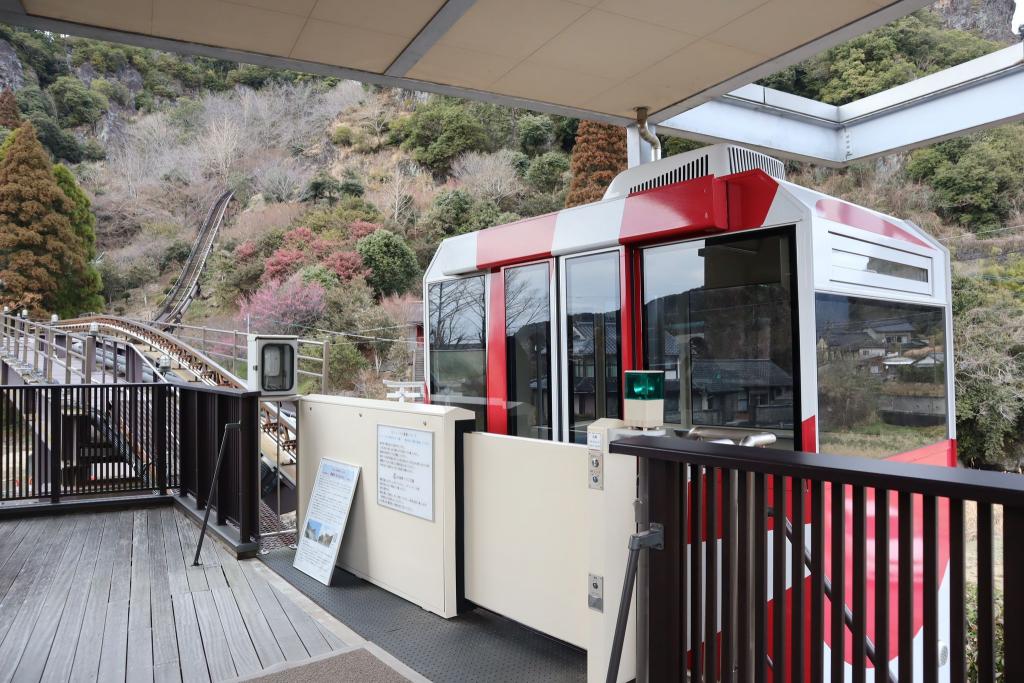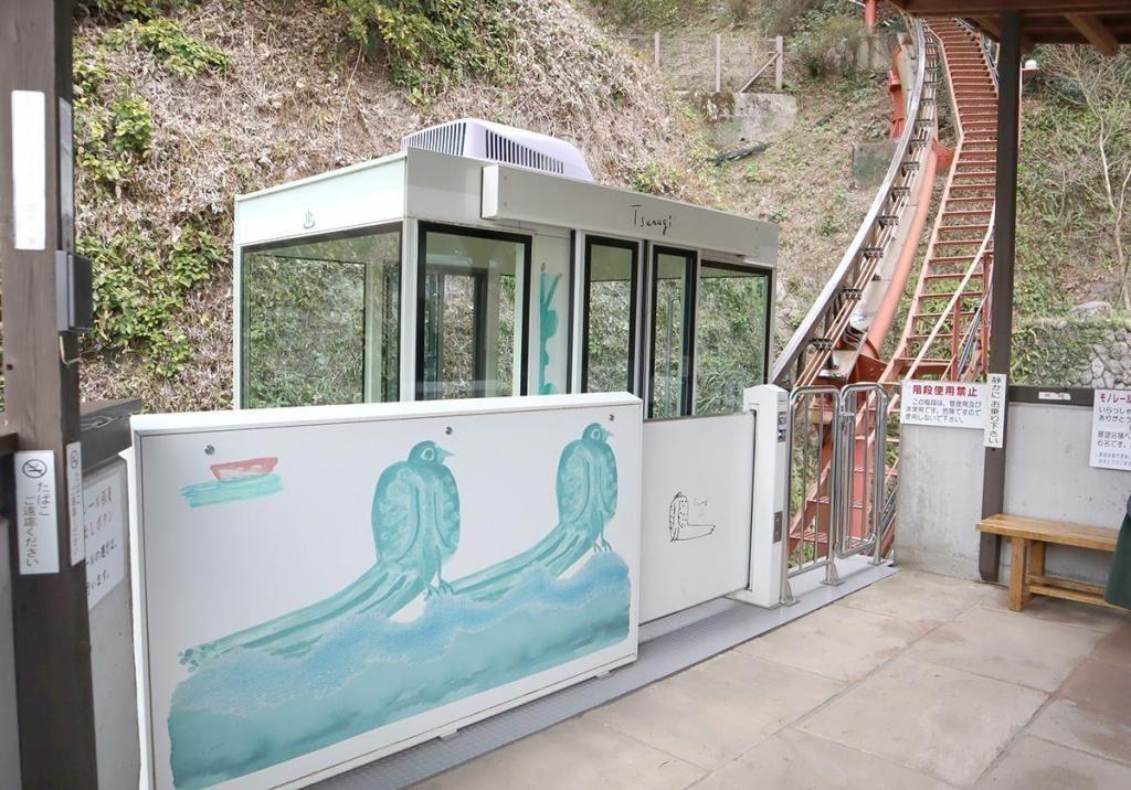 人気の「展望露天風呂」は、何と専用のモノレールに乗って移動します。崖沿いのルートをゆっくり上へ上へ進むと、ゴール地点には2つの貸切露天風呂が出現。
