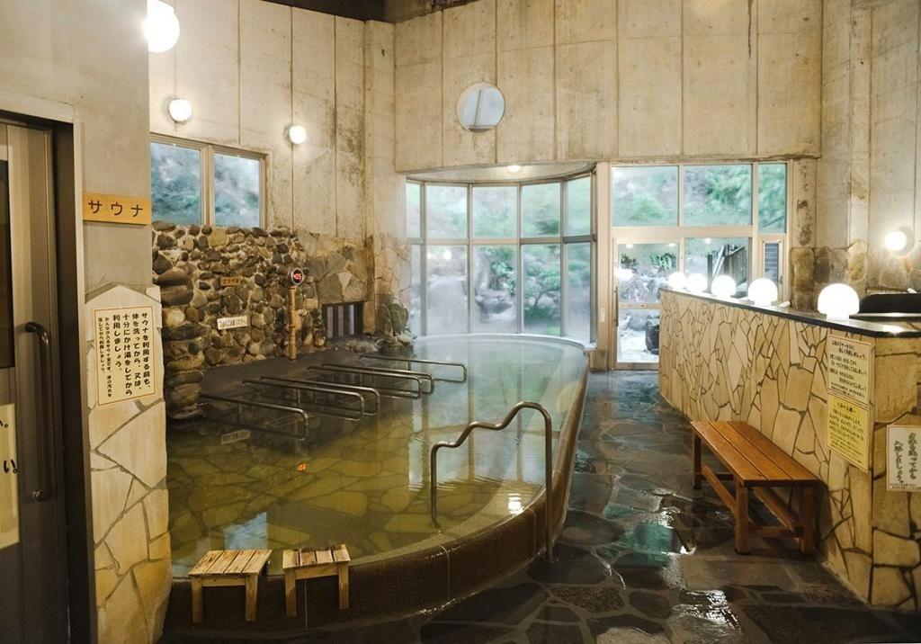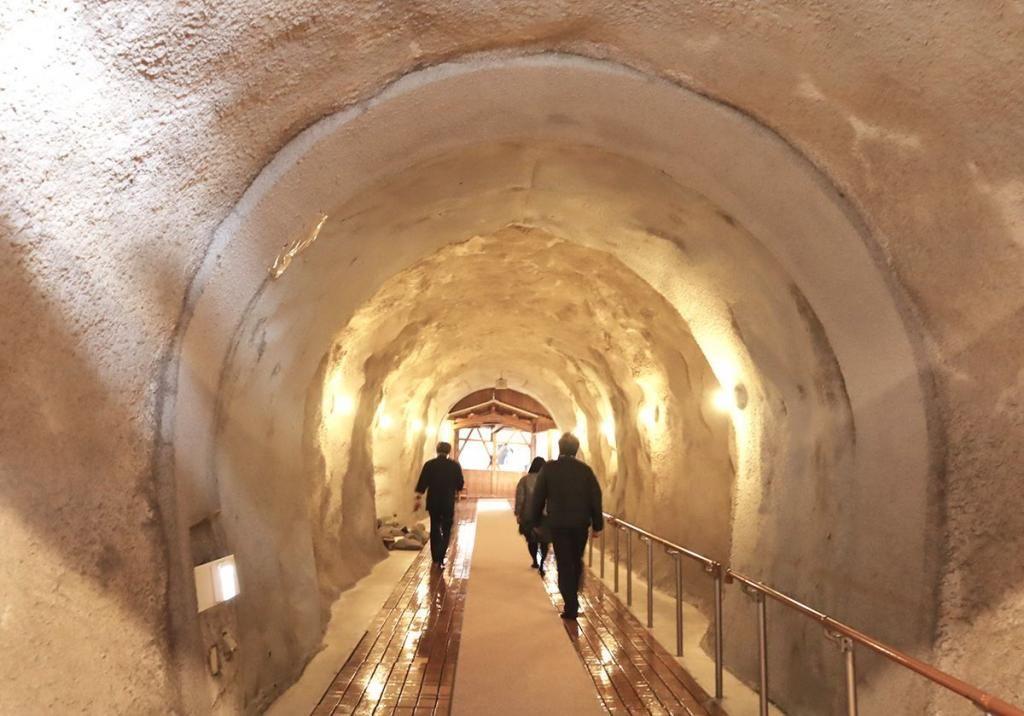 岩山をくりぬいた洞窟トンネルを抜けると…、その先にあるのが大人400円のリーズナブル料金で入浴できる日帰り温泉(大浴場)。