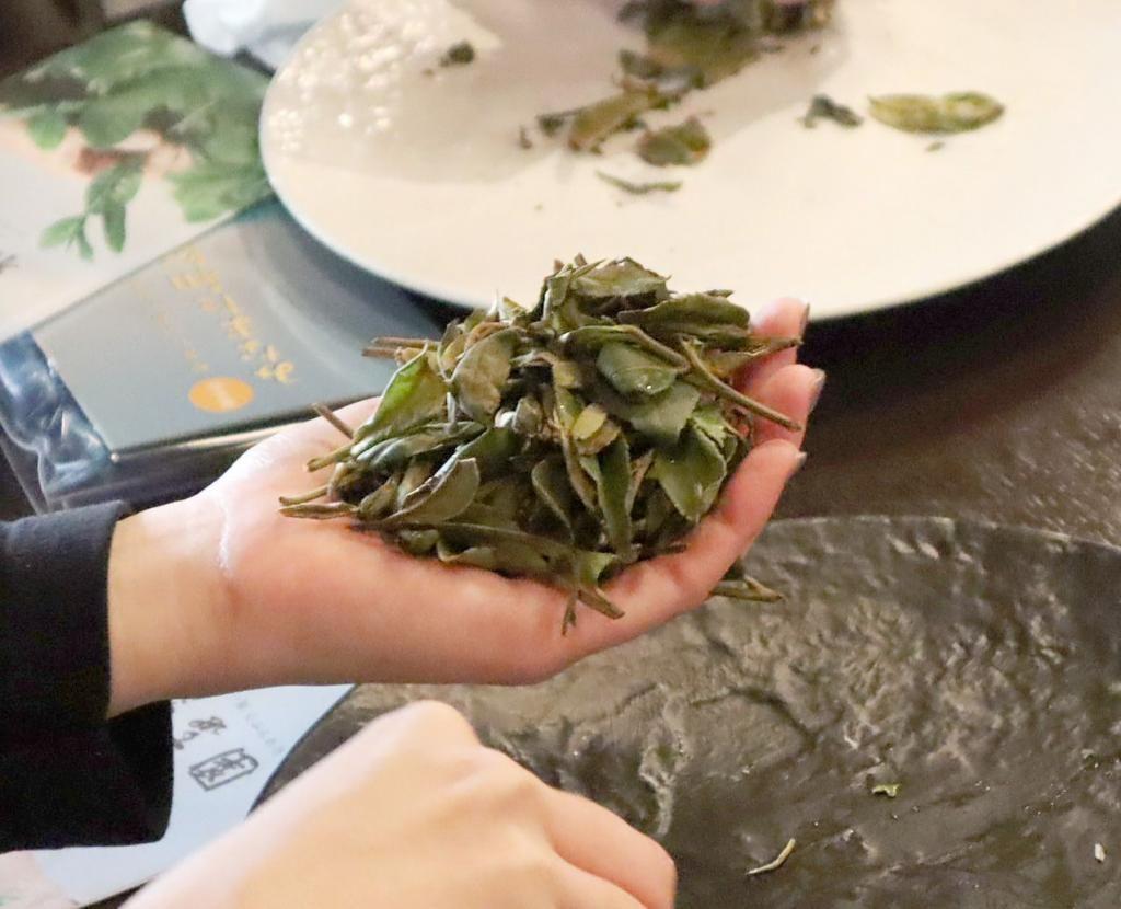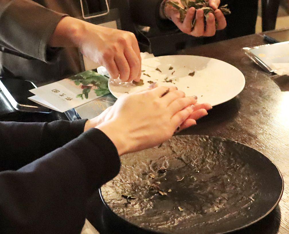 まずは茶葉を手のひらに集めて、両手でくるくる、くるくる…。