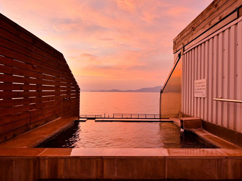 中尾山公園からは車で20分ほど。不知火海に面した立地で、「日本の夕陽100選」にも選ばれた夕日を眺めながら温泉三昧ができる、とっておきの場所なんです。