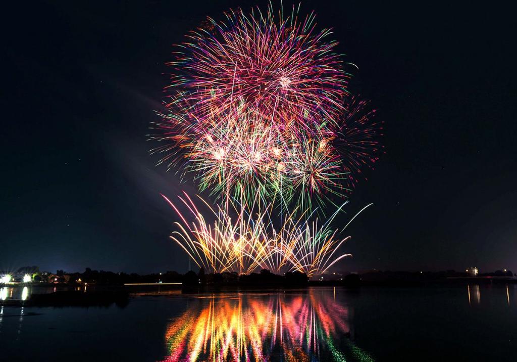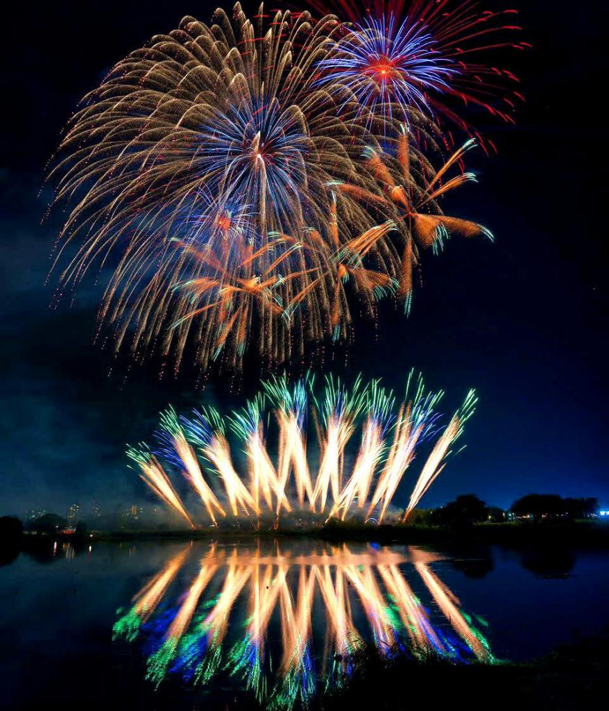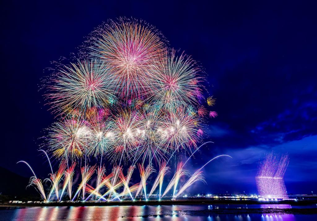 約10000発の花火が打ち上げられる県内最大の花火大会。市民の憩いの場「江津湖」で開催され、漆黒の夜空と湖面を絢爛豪華に彩ります。