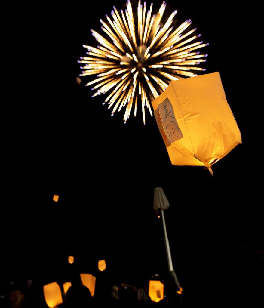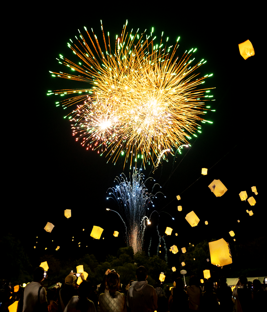 日中はにぎやかなステージイベントや地元グルメを満喫! 夕方から夜にかけては音楽とともに、スカイランタンと花火が夜空を彩る感動の瞬間が訪れます。特にスカイランタンが一斉に浮かび上がるシーンは写真映えも抜群。会場はダム湖の広がる自然豊かなロケーションで、澄んだ空気と水辺の景観がより一層の特別感を演出します。