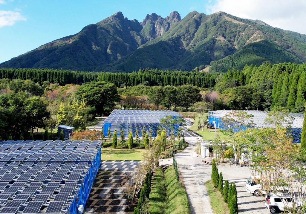 農園の敷地面積は東京ドーム約1個分(13800坪)。阿蘇山根子岳の絶景を望む大自然に囲まれた中で約30種類、2600本のブルーベリーが栽培されています。太陽光パネルの下でのポット栽培なので、日影で涼みながら摘み取り体験ができると好評です。