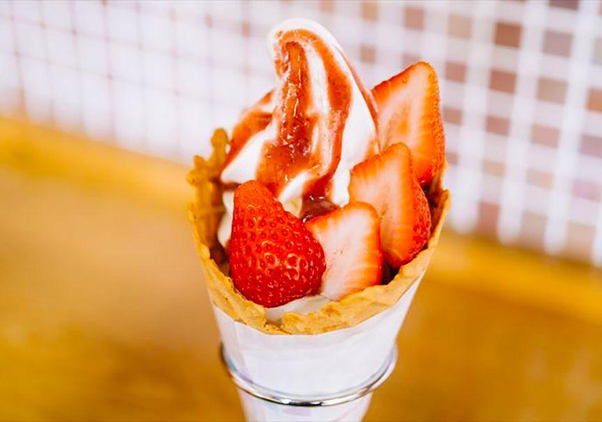 併設のカフェで味わえる、いりごの果肉入りソフトクリームは絶品。ぜひご賞味あれ!