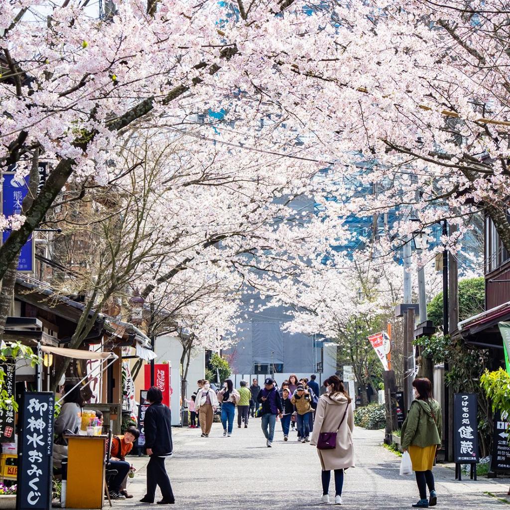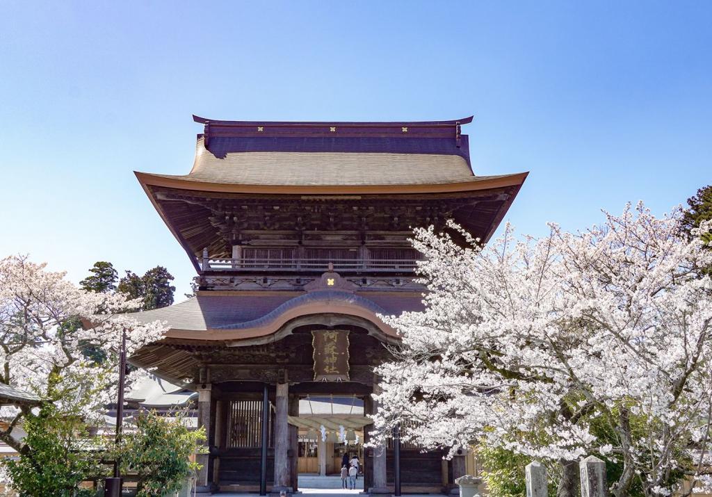 2000年以上の歴史を持つ古社「阿蘇神社」。横参道から門前町商店街までにかけて、ソメイヨシノやヤマザクラなど約20本ほどの桜を楽しむことができます。
