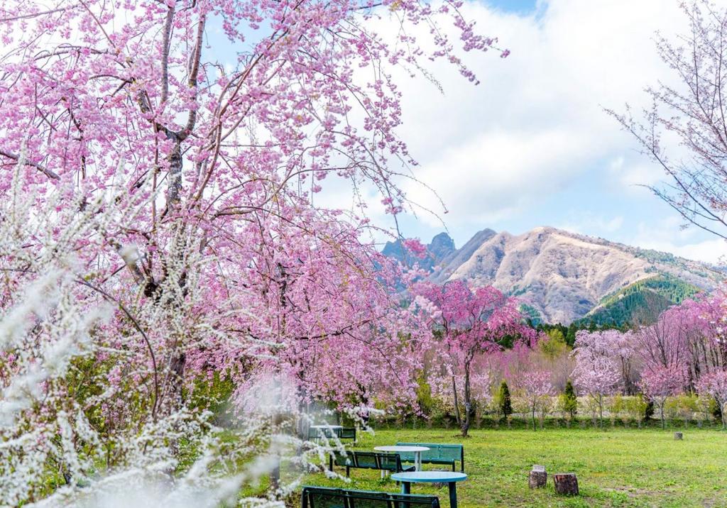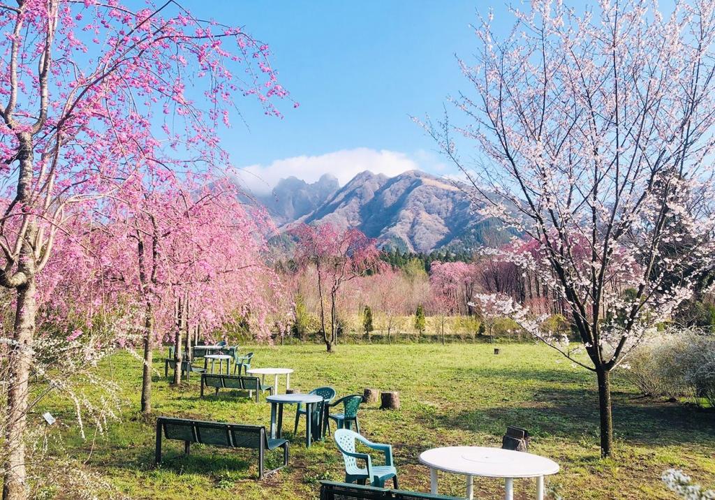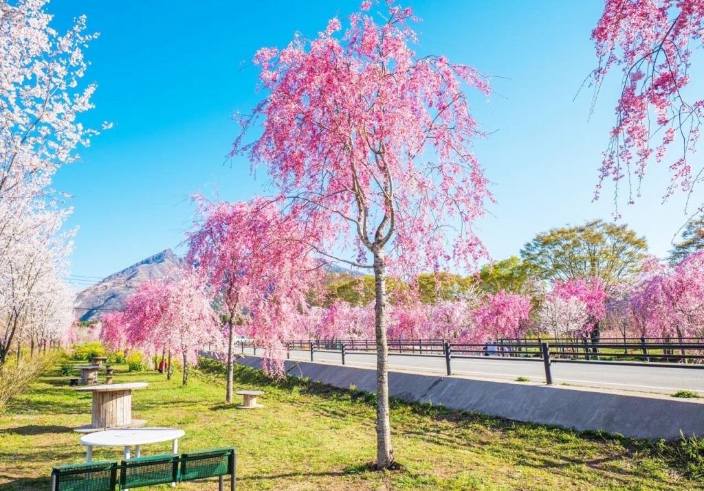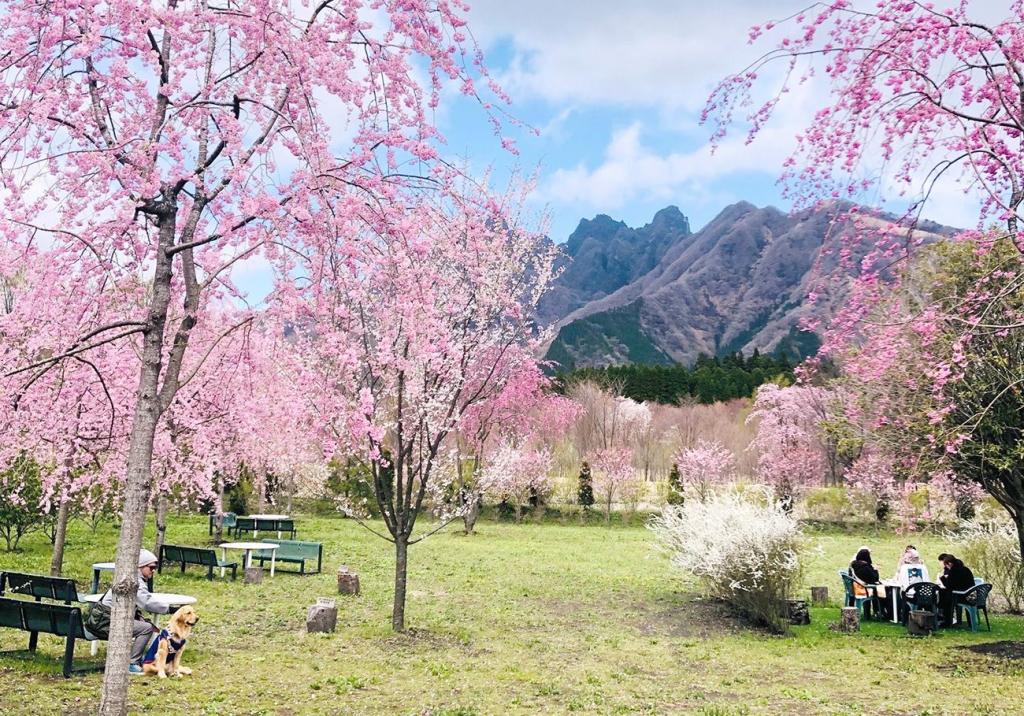 多品種の桜が大小100本以上植樹されているのですが、その魅力は何と言っても人工の障害物がない開放的な空間。テーブルやベンチも設置され、根子岳を間近に感じながら、ゆっくりとお花見が楽しめます。