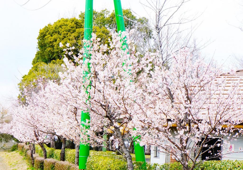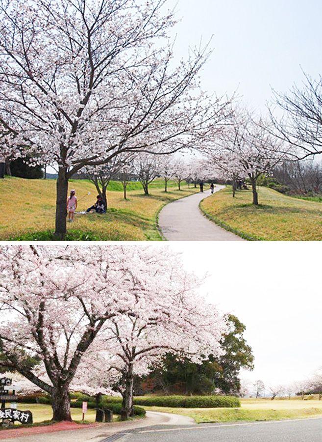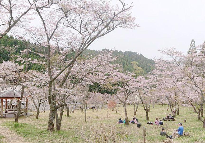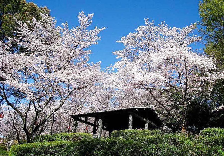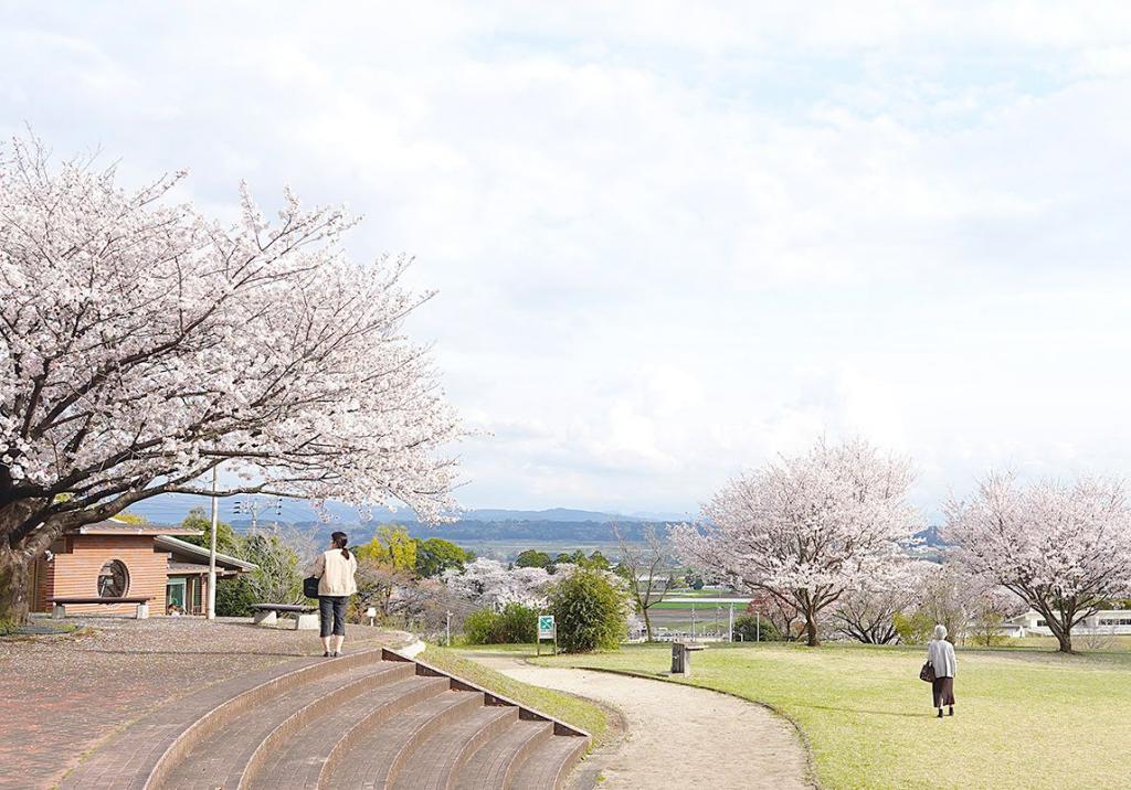 国指定史跡の江田船山古墳や藁葺屋根の古民家など、歴史を感じる風景と美しい桜を一緒に見ることができるスポット。公園には芝生が広く敷かれているので、ゆっくりくつろぎながらのお花見にもおすすめです。 肥後民家村では自然の中を散策しながらお花見ができ、施設内の各工房でクラフト体験や食事ができます。