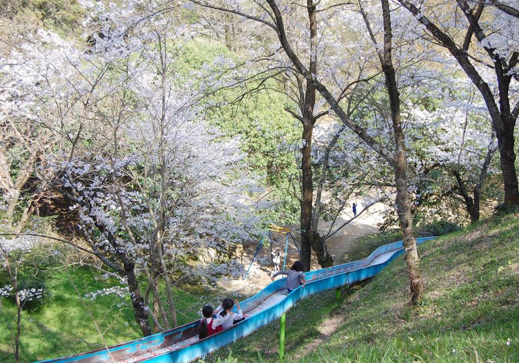 子ども達に人気の遊具や手ぶらで楽しめるパークゴルフ場なども併設。丘の上の展望所からは、桜と美しい山々が一望できます。