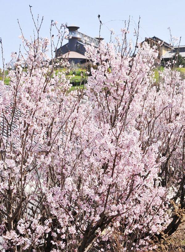 草枕温泉てんすいの関連施設「花の館」の周辺に、早咲きの「てんすい桜(啓翁桜)」が植えられています。3月上旬に自然開花が始まり、ソメイヨシノより一足早く花見を楽しむことができます。