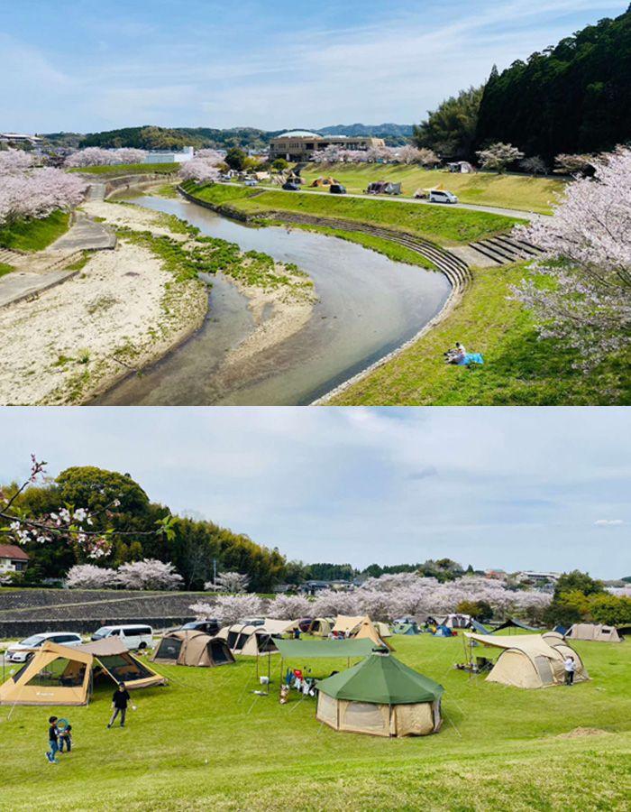 近くを流れる江田川のゆったりした風景と桜は相性抜群。キャンプ場内でお花見をしたり、江田川でカヌーを楽しみながら桜並木が鑑賞できるのも魅力です。
