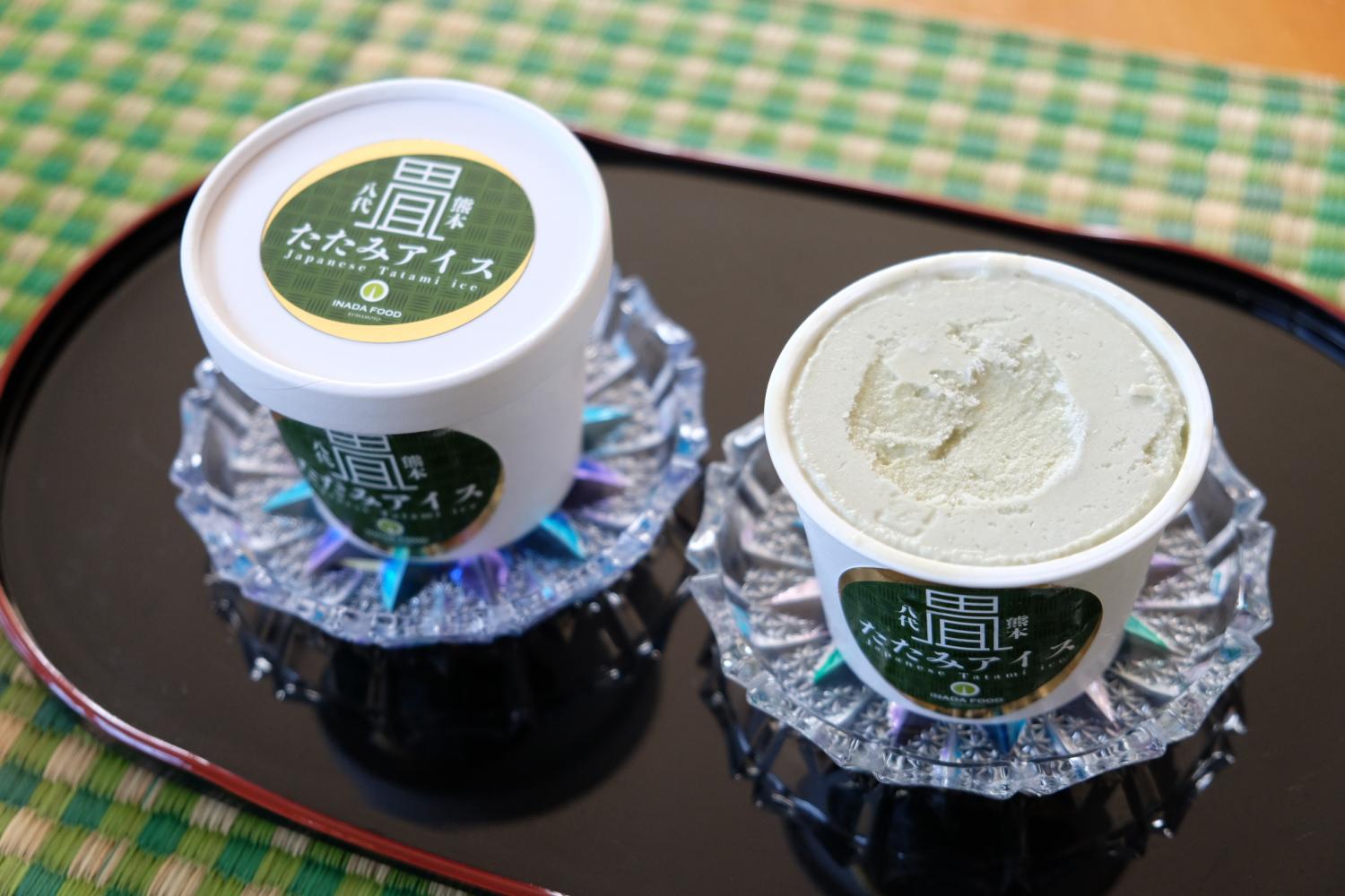 ③世界でも珍しい食べるい草の「藺草麺」と「たたみアイス」の試食。