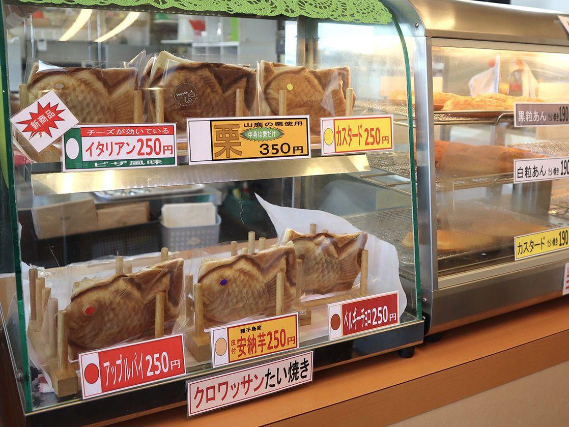 目印は「たい焼き」「たこ焼き」と書かれたのぼり。店内には様々な種類のたい焼きをメインに、たこ焼きやソフトクリーム、栗だんご、山鹿のメロンを使ったメロン100%ジュースなどが販売されています。