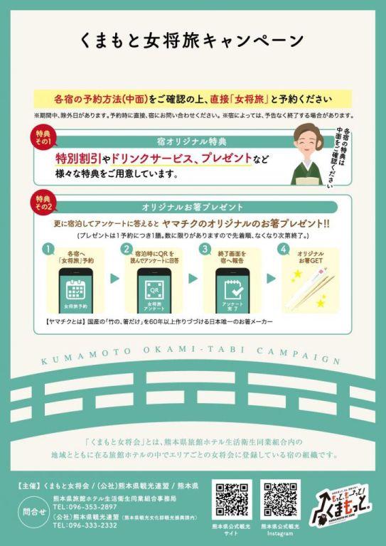 熊本県旅館ホテル生活衛生同業組合女将会(くまもと女将会)が実施している「くまもと女将旅キャンペーン」は好評につき延長します。終期については、決まり次第、本サイトでお知らせします。