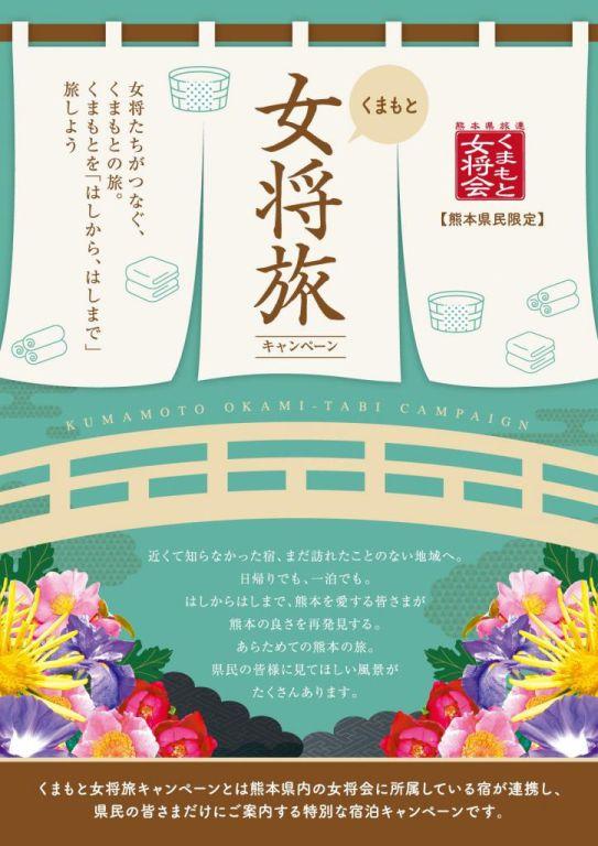 県内の女将会に所属している宿が連携し、県民の皆さんに県内をはしからはしまで、女将たちのおもてなしとともに旅していただき、熊本の魅力一つ一つに出会う旅を楽しんでいただきたいという思いから生まれた、県民限定の宿泊キャンペーンです。